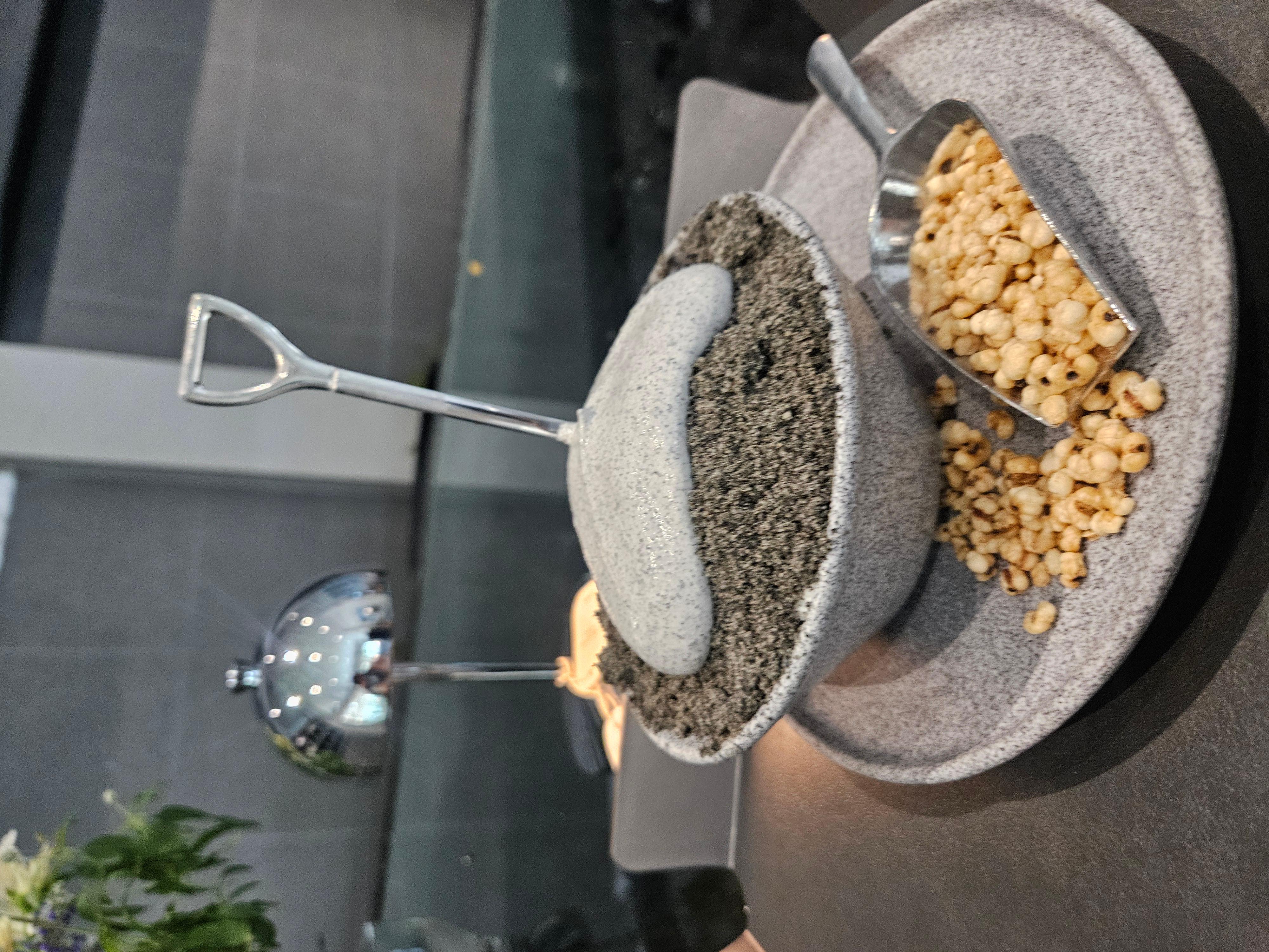 직원 추천으로 주문한 건 **‘흑임자 티라미수’**와 ‘씨멘트 라떼’!- 흑임자 티라미수는 단맛보다는 고소함이 중심인 디저트였어요. 크림은 부드럽고 쌉싸름한 흑임자 풍미가 깊게 퍼져요. 커피랑 완전 잘 어울리는 맛.